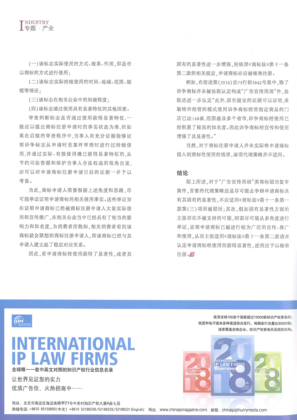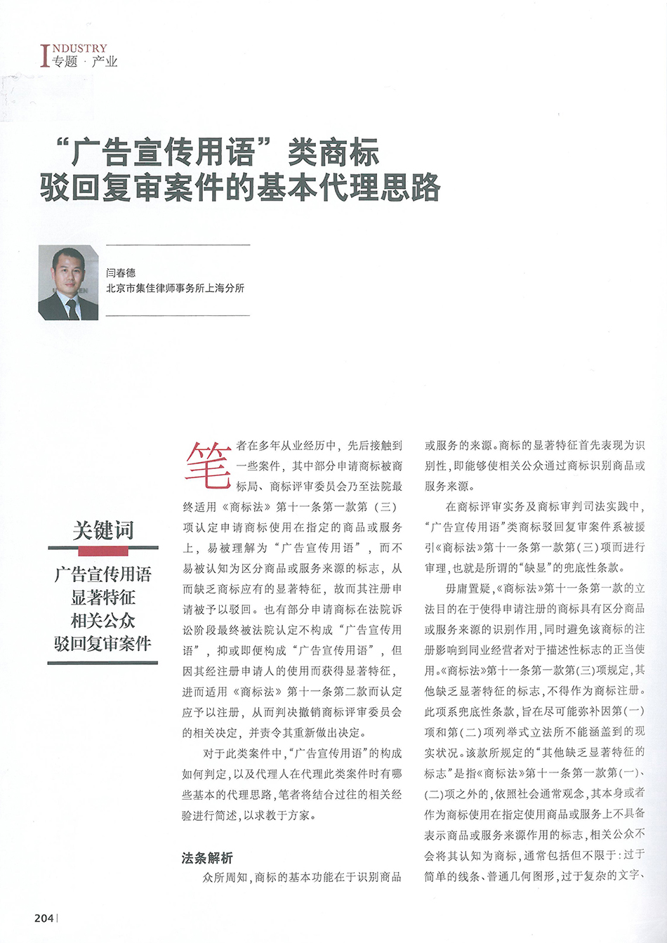 集佳文章《“廣告宣傳用語”類商標(biāo)駁回復(fù)審案件的基本代理思路》在《中國(guó)知識(shí)產(chǎn)權(quán)》發(fā)表