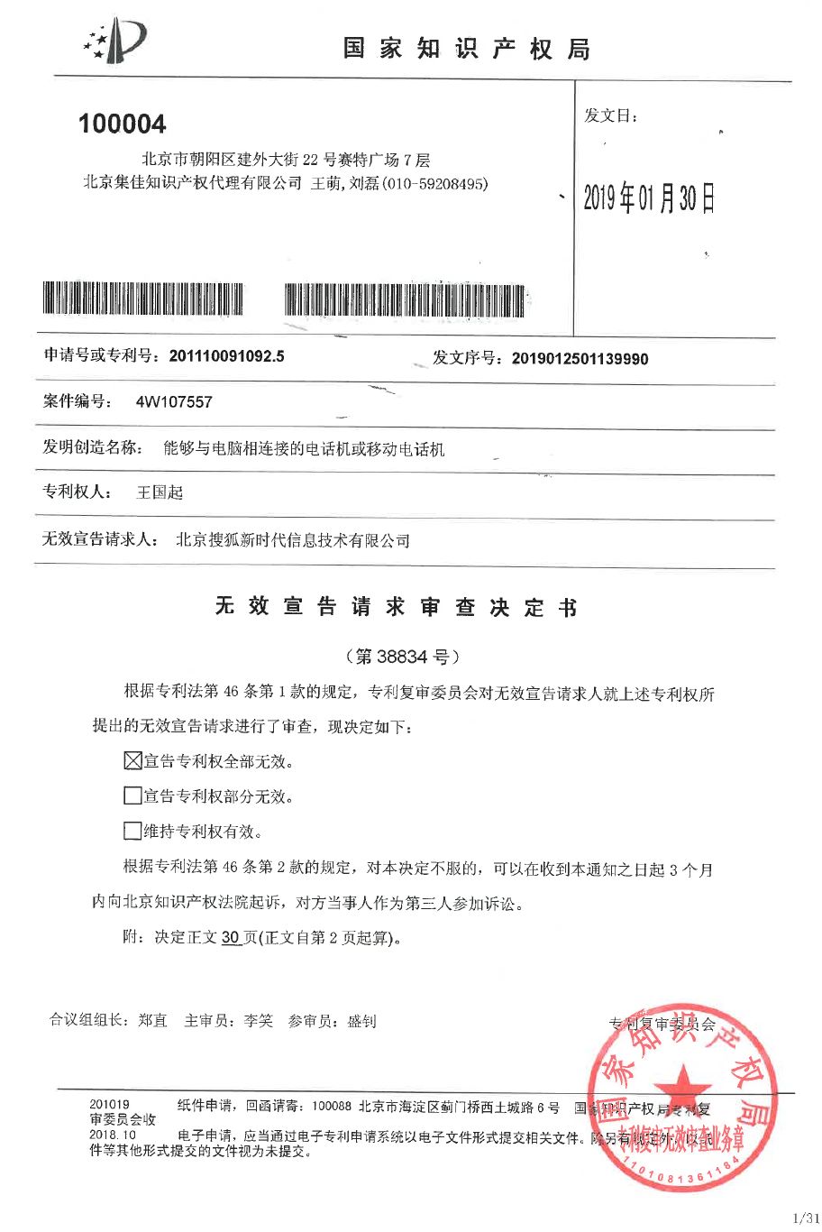 由于存在諸多特殊性,本案受到行業(yè)的高度關(guān)注。集佳公司接受搜狐公司委托,組建經(jīng)驗(yàn)豐富的專利無效團(tuán)隊(duì),團(tuán)隊(duì)成員深知該案的重要性,以高標(biāo)準(zhǔn)嚴(yán)要求的態(tài)度認(rèn)真對待無效過程中的每個(gè)環(huán)節(jié),從前期對比文件檢索,到無效請求材料的準(zhǔn)備,證據(jù)的補(bǔ)充,以及后期的口頭審理,承委托人之信任,擔(dān)盡力成事之責(zé)任,終于實(shí)現(xiàn)了委托人搜狐的期望,在新年來臨之前,收到復(fù)審委做出的無效決定。