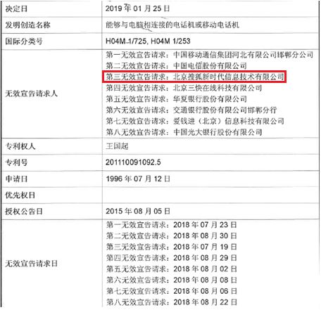 涉案專利名稱為“能夠與電腦相連接的電話機(jī)或移動電話機(jī)”,基于該專利,專利權(quán)人王國起自封“發(fā)漢字和圖像信息的電話機(jī)/移動電話機(jī)的全世界首創(chuàng)人”。2018年,王國起同時(shí)與中國移動、聯(lián)通、電信、搜狐、蘋果、華為、小米、錘子、農(nóng)行、交行等等30余家企業(yè)發(fā)生專利侵權(quán)行政糾紛,涉案金額共計(jì)數(shù)十億元之多。
