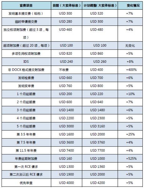 本次官費調(diào)整計劃基本涵蓋各項官費,包括2018年1月實施的新官費表中未調(diào)整的年費、OA答復(fù)延期費等,最大的調(diào)整包括專利訴訟請求費上調(diào)25%,年費遲交滯納金上調(diào)525%,外觀加速審查費上調(diào)122%,新增非DOCX文件的提交費。