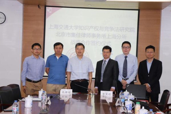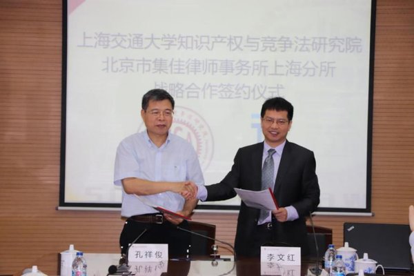 6月26日,北京市集佳律師事務(wù)所上海分所與上海交通大學(xué)知識(shí)產(chǎn)權(quán)與競(jìng)爭(zhēng)法研究院戰(zhàn)略合作協(xié)議簽約儀式在上海交大徐匯校區(qū)凱原法學(xué)樓隆重舉行。上海交通大學(xué)知識(shí)產(chǎn)權(quán)與競(jìng)爭(zhēng)法研究院院長(zhǎng)孔祥俊教授、劉維副教授,北京市集佳律師事務(wù)所上海分所主任李文紅、資深顧問王俊河、合伙人李擘、合伙人張振軍出席簽約儀式。
