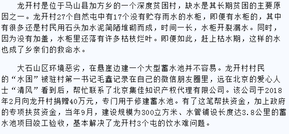 據(jù)了解,龍開村是目前南寧市僅剩的10個(gè)因脫貧指標(biāo)未達(dá)標(biāo)而沒脫貧摘帽的深度貧困村之一。該村山多地薄水少,由于季節(jié)性缺水,飲水困難、飲水衛(wèi)生的問題成為影響當(dāng)?shù)卮迕窕旧畹淖钔怀鰡栴},并深刻制約了當(dāng)?shù)氐慕?jīng)濟(jì)發(fā)展。2018年,北京集佳知識(shí)產(chǎn)權(quán)有限公司了解到這一情況之后,積極幫助龍開村出主意想辦法,并捐贈(zèng)40萬元,在龍開村仲團(tuán)屯修建了蓄水池工程,徹底解決了多年來長期困擾三個(gè)屯村民的飲水難問題,并改善了農(nóng)業(yè)生產(chǎn)條件,為當(dāng)?shù)卮迕窆?jiān)脫貧提供了信心和希望。2019年5月13日,龍開村黨支部第一書記毛鑫等一行4人代表村民為集佳贈(zèng)送“愛心傾注龍開蓄水池,精準(zhǔn)扶貧深度貧困村”錦旗,表達(dá)了龍開村民的真誠謝意。