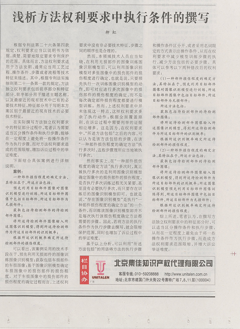 集佳文章《淺析方法權(quán)利要求中執(zhí)行條件的撰寫(xiě)》在《中國(guó)知識(shí)產(chǎn)權(quán)報(bào)》發(fā)表