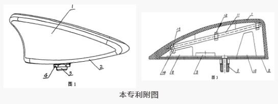 該專利的權(quán)利要求1內(nèi)容為“一種鯊魚鰭式天線,其特征在于具有天線外殼,天線外殼內(nèi)側(cè)上部設(shè)置有無線電接收天線,無線電接收天線一端設(shè)有天線信號輸出端,天線信號輸出端通過天線連接元件與天線放大器信號輸入端相連接,或直接與同軸電纜匹配相連,天線外殼底部裝有安裝底板;所述無線電接收天線通過注塑嵌裝或固定卡裝在天線外殼內(nèi)側(cè)上部;在天線外殼內(nèi)側(cè)上部設(shè)置有無線電接收天線,所述無線電接收天線采用螺旋狀彈簧天線、或金屬天線,增加了天線接收無線電信號的有效長度,實現(xiàn)360度全向性信號接收;所述無線電接收天線為AM/FM共用天線?!?/p>