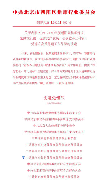 7月1日,在慶祝中國共產(chǎn)黨成立99周年之際,中共北京市朝陽區(qū)律師行業(yè)委員會(huì)下發(fā)文件表彰2019-2020年度朝陽區(qū)律師行業(yè)先進(jìn)黨組織及個(gè)人,集佳律所黨支部被授予“先進(jìn)黨組織”光榮稱號(hào)。