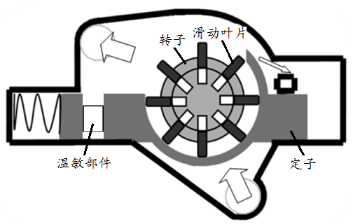 例如,如圖2所示,在一種可變油量泵的發(fā)明創(chuàng)造中,包括轉(zhuǎn)子和定子,轉(zhuǎn)子的外周插接有若干滑動(dòng)葉片,定子包括弧形部和桿部,桿部與溫敏部件相接觸。當(dāng)泵腔內(nèi)的油溫發(fā)生變化時(shí),溫敏部件的長(zhǎng)度可以發(fā)生變化,能夠推動(dòng)定子進(jìn)行直線位移,進(jìn)而帶動(dòng)相應(yīng)滑動(dòng)葉片插入轉(zhuǎn)子不同深度,這樣可以調(diào)整排量。