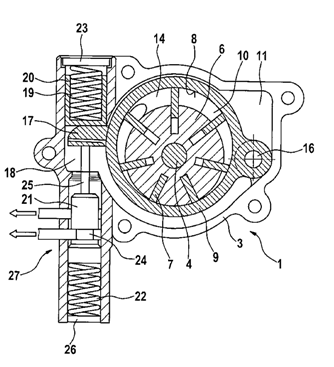 在對(duì)該案件的審查過(guò)程中,審查人員找到了最接近現(xiàn)有技術(shù)(對(duì)比文件3),如圖3所示,其同樣包括溫敏部件21和定子8、轉(zhuǎn)子6以及滑動(dòng)葉片7。所不同的是,對(duì)比文件3中的定子為鉸接設(shè)置,溫敏部件通過(guò)推動(dòng)定子轉(zhuǎn)動(dòng)來(lái)調(diào)節(jié)滑動(dòng)葉片在轉(zhuǎn)子中的插接深度,進(jìn)而調(diào)整排量。審查人員認(rèn)為直線位移和旋轉(zhuǎn)位移是常規(guī)的位移形式,可以相互替換,并以此為由來(lái)否定本發(fā)明創(chuàng)造的創(chuàng)造性,后續(xù)爭(zhēng)辯過(guò)程中,審查人員又檢索到了定子可直線位移的其他現(xiàn)有技術(shù),來(lái)進(jìn)一步地否定本發(fā)明創(chuàng)造的創(chuàng)造性。