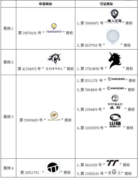 如表格二的案例3所示,雖然申請商標(biāo)“ ”包含了具有一定顯著性的文字,但是考慮到其與引證商標(biāo)“