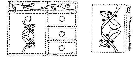而如果一件外觀設(shè)計(jì)的保護(hù)客體僅在于表面圖案,那么其必須以產(chǎn)品為載體,這也相當(dāng)于一種局部外觀設(shè)計(jì)了。這種情況下也是用虛線來(lái)表示產(chǎn)品的輪廓,下方圖4是Design Patent Application Guide中的示例,所保護(hù)的是珠寶盒上的表面圖案。