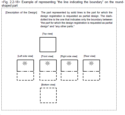為了表達(dá)要求保護(hù)的局部外觀設(shè)計(jì),可以借助于虛線和實(shí)線,或者可以使用不同的色塊,或者用點(diǎn)劃線來(lái)表示分界線。此外,日本還規(guī)定在外觀設(shè)計(jì)說(shuō)明中通過(guò)文字明確請(qǐng)求保護(hù)的部分,比如指出實(shí)線所示的部分是請(qǐng)求保護(hù)的局部外觀設(shè)計(jì),或色塊之外的其他部分是請(qǐng)求保護(hù)的局部外觀設(shè)計(jì)。