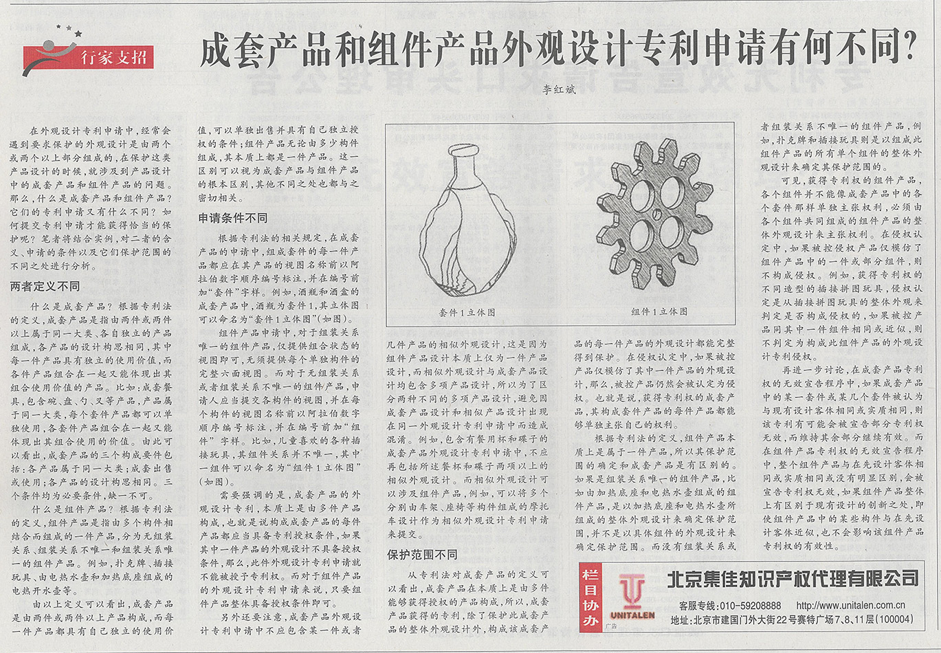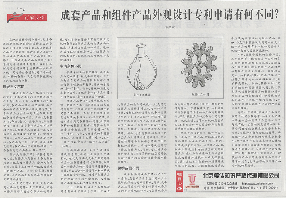 集佳文章《成套產(chǎn)品和組件產(chǎn)品外觀設(shè)計(jì)專利申請(qǐng)有何不同?》在《中國(guó)知識(shí)產(chǎn)權(quán)報(bào)》發(fā)表