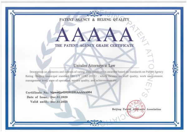 On June 4, 2021, the Beijing Intellectual Property Office and the Beijing Patent Attorneys Association held the awarding ceremony of 2020 patent agency rating in Beijing, and Unitalen was awarded as Beijing "AAAAA Patent Agency", the highest grade, once again.