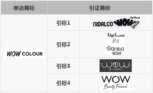 其次,從本案修改標(biāo)樣的結(jié)果來看,不帶空格的“WOWCOLOUR”雖然并非固有詞匯,但審查員仍會(huì)認(rèn)定為與在先商標(biāo)近似,因?yàn)樯虡?biāo)被拆分審查的情形較為常見。而“”標(biāo)樣依然無法克服上述在先商標(biāo),原因是審查員認(rèn)為“WOW”是申請(qǐng)商標(biāo)的主要顯著部分,“