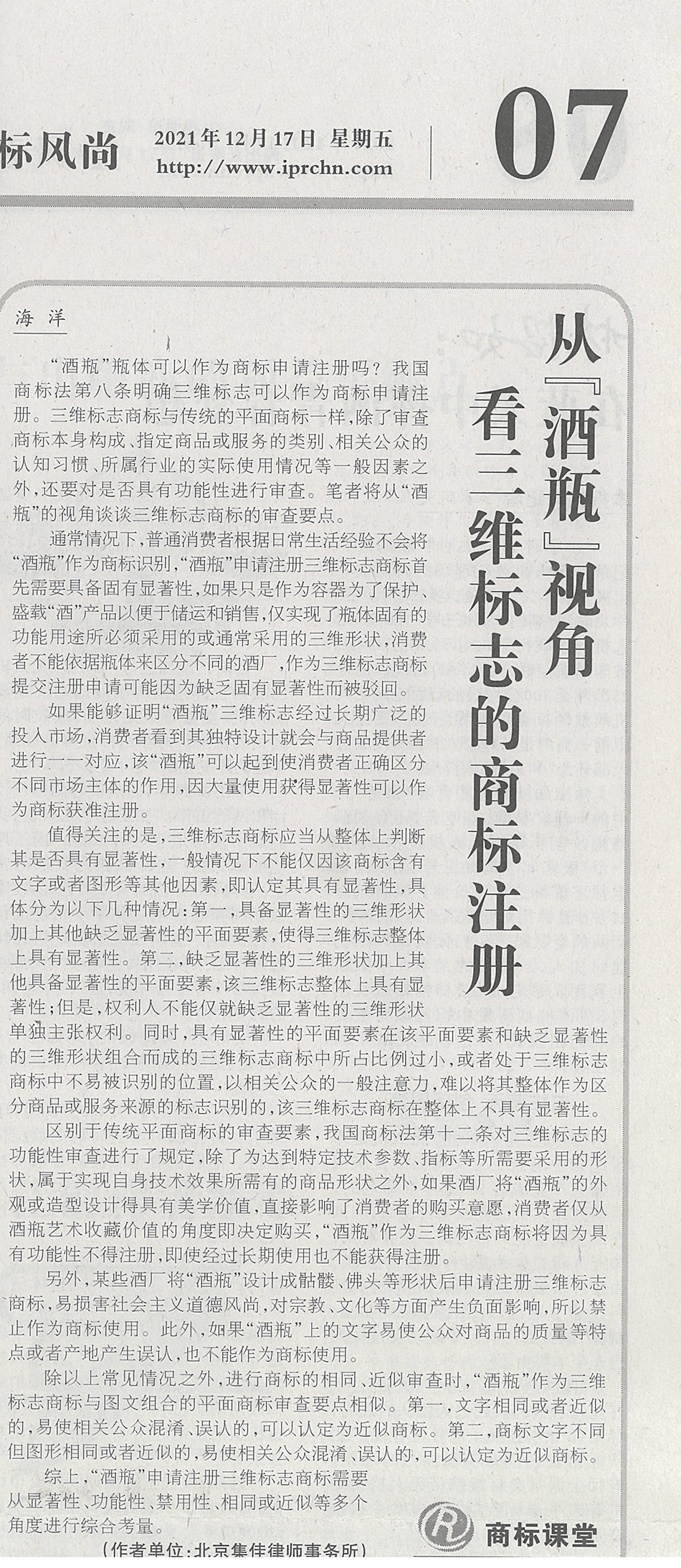 集佳文章《從「酒瓶」視角看三維標志的商標注冊》在《中國知識產(chǎn)權(quán)報》發(fā)表