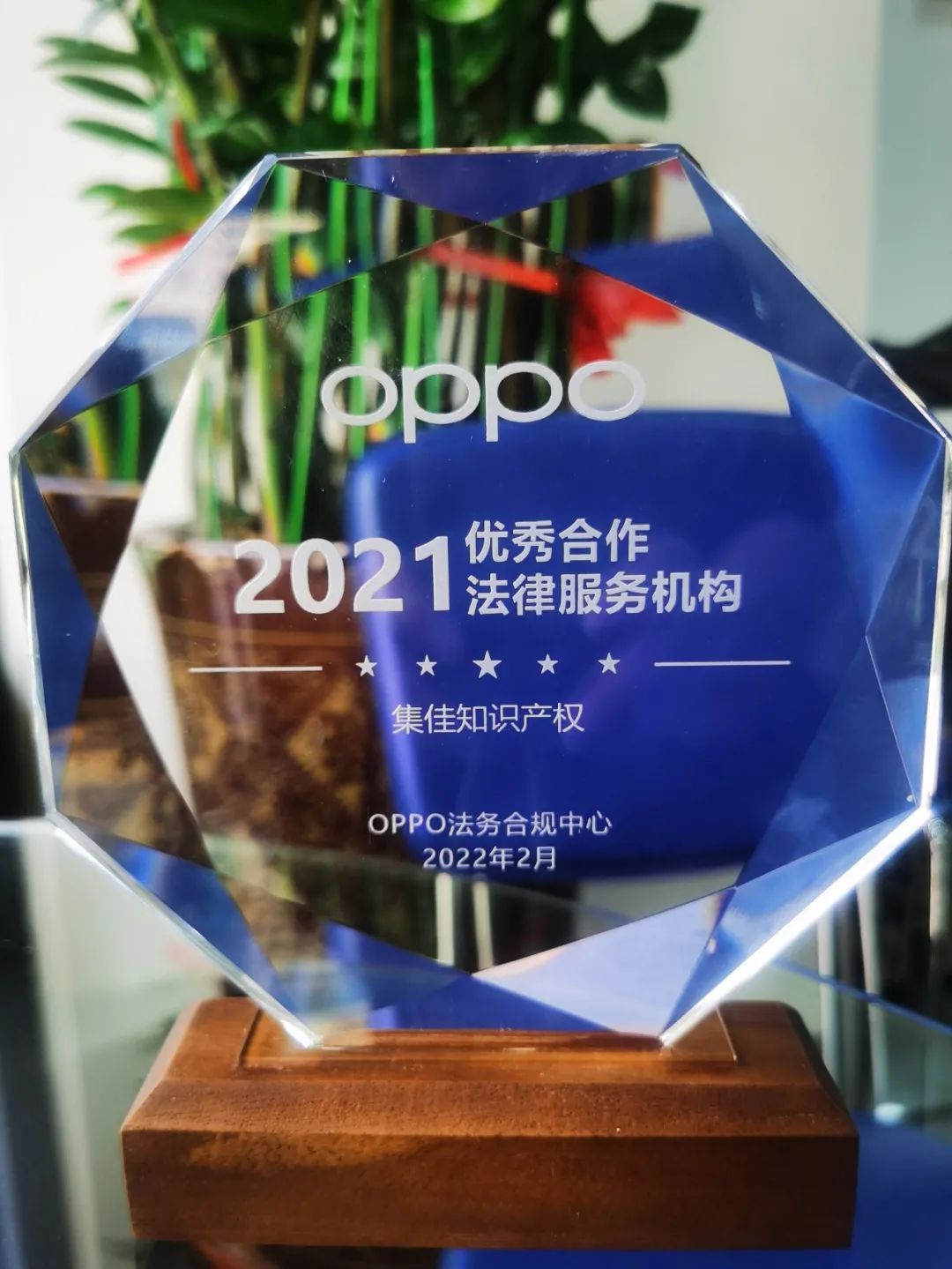 近日,集佳優(yōu)質(zhì)服務(wù)再次喜獲客戶點贊——OPPO授予集佳“2021優(yōu)秀合作法律服務(wù)機(jī)構(gòu)”。