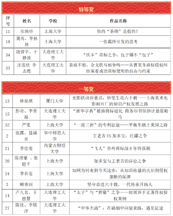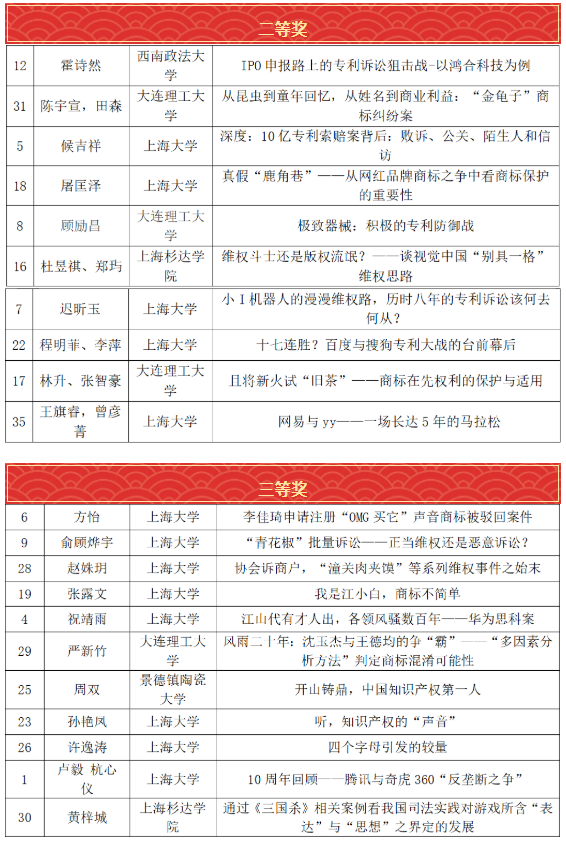 由集佳律所上海分所贊助、上海大學(xué)法學(xué)院/知識(shí)產(chǎn)權(quán)學(xué)院主辦的首屆“知識(shí)產(chǎn)權(quán)?中國(guó)故事”撰寫(xiě)比賽,經(jīng)過(guò)參賽作品展示、入圍初選、專家評(píng)審以及決賽答辯等環(huán)節(jié)的激烈角逐,于2022年3月26日在上海大學(xué)圓滿落下帷幕,來(lái)自上海大學(xué)、大連理工大學(xué)、西南政法大學(xué)、上海杉達(dá)學(xué)院、廈門(mén)大學(xué)、內(nèi)蒙古財(cái)經(jīng)大學(xué)、景德鎮(zhèn)陶瓷大學(xué)和華中師范大學(xué)的35組本科生及研究生摘奪了35個(gè)專業(yè)獎(jiǎng)項(xiàng)。