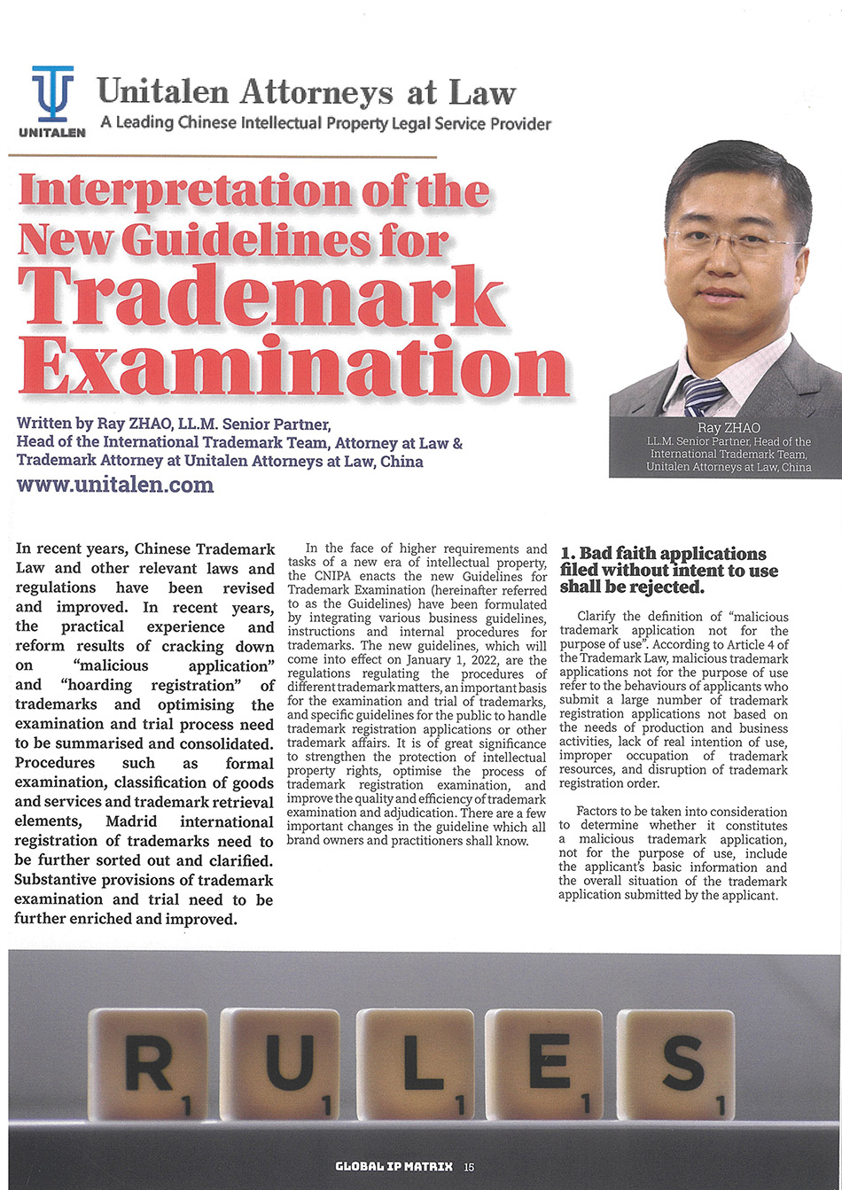 集佳文章《Interpretation of the New Guidelines for Trademark Examination》在《The global IP Matrix》發(fā)表