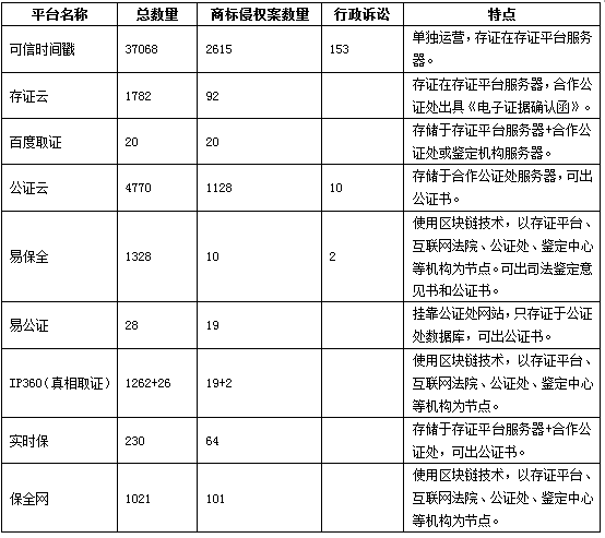 上述表格在一定程度上體現(xiàn)了各電子存證平臺的使用頻次。
