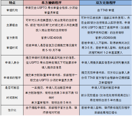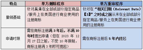 單方撤銷程序分為單方刪除程序和單方重審程序,根據(jù)美國《商標(biāo)法》第16A、16B條及《審查指南》第1716條的規(guī)定,筆者將這兩項(xiàng)程序簡要對比如下表: