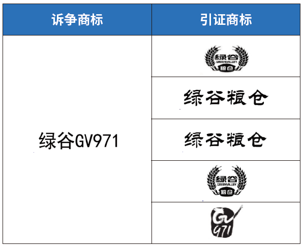 案例一中,訴爭商標(biāo)“ ”和引證商標(biāo)1-4相比較,其中文部分僅為“綠谷”;即便其中還包含“GV971”,但是整體上沒有形成能夠和引證商標(biāo)區(qū)分開的含義。訴爭商標(biāo)和引證商標(biāo)5相比較,“GV971”部分完全相同,即便其中還包含“綠谷”,但依然很容易被視為雙方存在特定關(guān)聯(lián)。