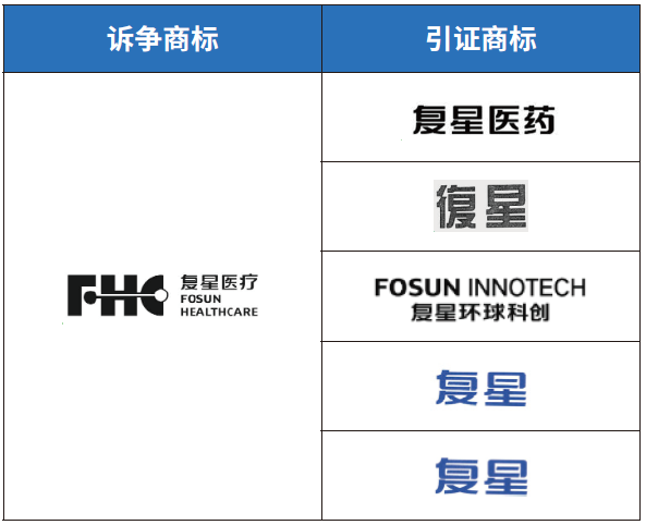 案例二中,訴爭商標(biāo)“ ”雖然和各引證商標(biāo)均包含“復(fù)星”,但訴爭商標(biāo)中包含多種構(gòu)成要素,中文部分整體為“復(fù)星醫(yī)療”,再加上其英文部分“FOSUN HEALTHCARE+FHG”,從而在商標(biāo)的整體外觀、呼叫以及含義上均和各引證商標(biāo)產(chǎn)生了一定的差異,降低了混淆的可能性。