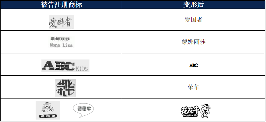 ”被認定構(gòu)成“變形使用”、侵權(quán)成立。(2)若由于商業(yè)使用環(huán)境等客觀需要,導致被訴標識與注冊樣式稍有差別,一般不輕易判為“變形使用”,如“蒙娜麗莎”“愛國者”“ABC”等案件。法院認為,被訴標識雖與注冊商標有所差異,但未改變顯著特征,仍屬于對注冊商標的合理使用。