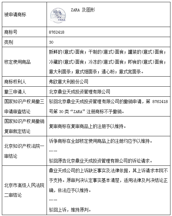 2019年01月15日,北京鼎業(yè)天成投資管理有限公司向國(guó)家知識(shí)產(chǎn)權(quán)局商標(biāo)局提交撤銷三年不使用申請(qǐng),申請(qǐng)撤銷弗歐意大利股份公司名下第8762418“ZARA及圖形”商標(biāo)在第30類“新鮮的(意式)面食”等全部核定使用商品上的注冊(cè)。弗歐意大利股份公司在收到商標(biāo)局下發(fā)的提供使用證據(jù)通知后,于規(guī)定期限內(nèi)提交了答辯理由及被申請(qǐng)商標(biāo)在指定期限內(nèi)(即2016年01月15日至2019年01月14日)的使用證據(jù)。2019年08月27日,商標(biāo)局經(jīng)審查,裁定被申請(qǐng)商標(biāo)不予撤銷。