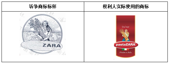 由以上對(duì)比可以看出,權(quán)利人實(shí)際使用的商標(biāo),圖形背景部分與注冊(cè)商標(biāo)形狀略有不同,文字部分也多了英文“pasta”,但“pasta”中文含義為“意大利面食”,實(shí)際上為訴爭(zhēng)商標(biāo)核定使用商品的通用名稱,因此自身缺乏顯著性,權(quán)利人實(shí)際使用的商標(biāo)顯著性識(shí)別要素仍為“ZARA及圖形”。