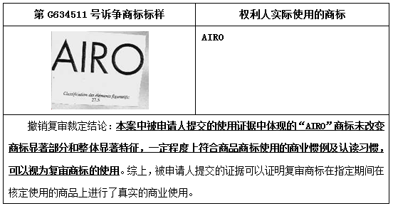 本案的亮點(diǎn)一,在于從行政階段到法院訴訟階段,國(guó)知局、一審法院、二審法院均對(duì)權(quán)利人對(duì)訴爭(zhēng)商標(biāo)在使用方式上的輕微改變?nèi)哉J(rèn)可為有效使用證據(jù),即“對(duì)訴爭(zhēng)商標(biāo)未改變顯著特征的使用”。
