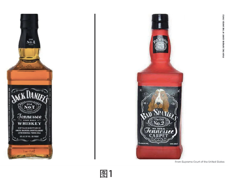 威士忌品牌Jack Daniel's(下稱“杰克丹尼”)訴寵物玩具公司VIP Products LLC(下稱“寵物玩具公司”)商標(biāo)侵權(quán)一案,由美國最高法院于2023年6月8日宣判,標(biāo)志著這場始于2014年的案件有了最終結(jié)果。涉案商品是一款寵物狗咀嚼玩具,其外形與杰克丹尼酒瓶近似(見圖1),主體部分文字為“Bad Spaniels”,字體采用相同的反顯,將杰克丹尼的“Old No.7 Brand Tennessee Sour Mash Whiskey”,改成了“The Old No.2 On Your Tennessee Carpet”。杰克丹尼這款經(jīng)典酒含有40%的酒精含量,而涉案玩具商品承諾含有“43%的大便,保證100%臭烘烘”。寵物玩具公司是美國第二大寵物玩具生產(chǎn)商,其還生產(chǎn)其他寵物狗咀嚼系列玩具“Silly Squeakers”,模仿戲謔其他酒類品牌,如Dos Perros(戲仿Dos Equis)、Smella Arpaw(戲仿Stella Artois)以及Doggie Walker(戲仿Johnnie Walker)。