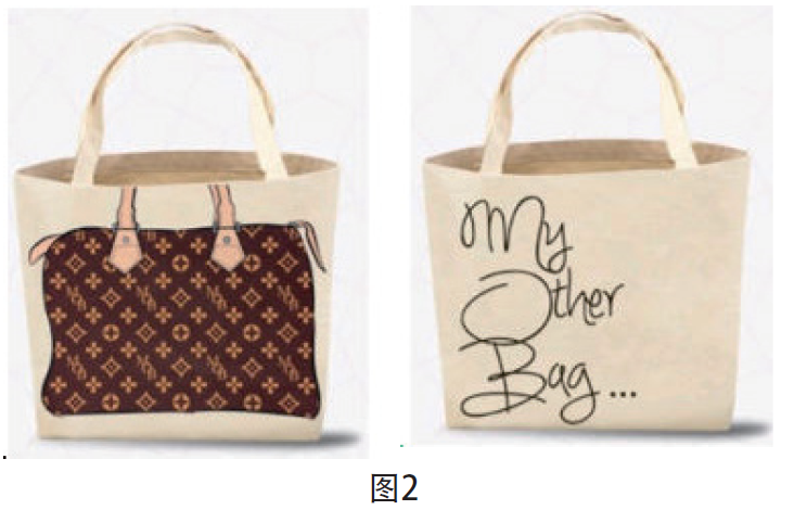 2014年,路易威登(Louis Vuitton)對一家女士托特包生產(chǎn)商“My Other Bag”(我的另一個包)發(fā)起了訴訟。My Other Bag主要銷售價格親民的帆布托特包,在其廣告宣傳中,左側(cè)出現(xiàn)大牌托特包的圖片,右側(cè)寫著“我的另一個包”,包形與路易威登的托特包一致(見圖2)。My Other Bag的創(chuàng)始人Tara Martin女士辯稱,設(shè)計這種包的目的是為具有環(huán)保理念的消費者提供具有設(shè)計感的可重復(fù)使用托特包,而不必背著昂貴的大牌包裝生活用品。Martin女士解釋道,研發(fā)此款托特包的初衷是“玩笑式地戲仿”大牌托特包,主打?qū)嵱眯?,以給消費者帶來多元的品位和選擇。