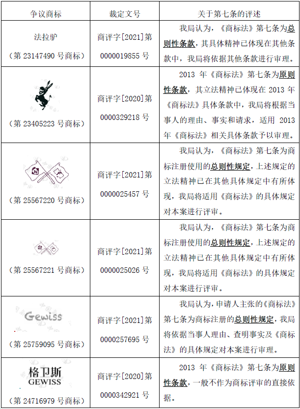 而在過往大多數(shù)異議、無效宣告案件中,“誠(chéng)實(shí)信用原則”都被評(píng)價(jià)為“總則性條款”“原則性條款”,例如,下表所列的6件無效宣告案件均將申請(qǐng)人基于第七條的評(píng)審請(qǐng)求評(píng)述為“總則性條款”,認(rèn)為誠(chéng)實(shí)信用原則具體精神已體現(xiàn)在其他條款中,案件需依據(jù)其他具體性條款進(jìn)行評(píng)價(jià):