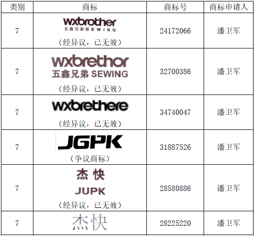 杰克科技股份有限公司(申請(qǐng)人)對(duì)潘衛(wèi)軍(被申請(qǐng)人)在第7類“縫紉機(jī);包縫機(jī);鎖扣機(jī);裁布機(jī);工業(yè)縫紉機(jī)臺(tái)板;撬邊機(jī);下料機(jī)(縫紉機(jī)械);卷邊機(jī);熨衣機(jī);紡織品用便攜式旋轉(zhuǎn)蒸汽熨壓機(jī)”商品上申請(qǐng)注冊(cè)的第31887526號(hào)“”商標(biāo)(爭(zhēng)議商標(biāo))提出無(wú)效宣告申請(qǐng),認(rèn)為該商標(biāo)與其在先注冊(cè)的“
