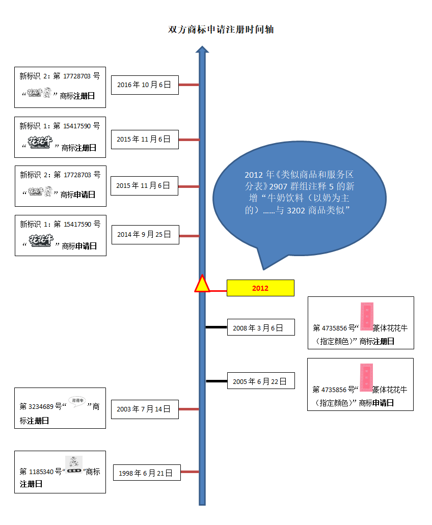 2012年《類似商品和服務區(qū)分表》2907群組注釋5的新增,直接導致之前不類似的“牛奶飲料(以奶為主)”和3202群組飲料商品構成類似。河南鄭牛隨后遂開始通過引證第4735856號“篆體花花牛(指定顏色)”商標挑戰(zhàn)花花牛新標識“圖片”“圖片”在牛奶飲料(以牛奶為主)商品項目上的注冊,導致上述兩個新標識在“牛奶飲料(以牛奶為主)”商品項目上的無效。同時,河南鄭牛還持續(xù)以普通花花牛字體在和花花牛乳業(yè)公司主營商品項目相同、類似或者高度關聯(lián)的商品項目上申請注冊商標,雙方隨即陷入持續(xù)數(shù)年的商標確權僵局。