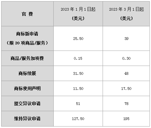 涉及商標相關業(yè)務的最新收費以及實施階段具體如下(依據2022 年 12 月 27 日的匯率):