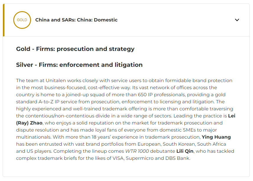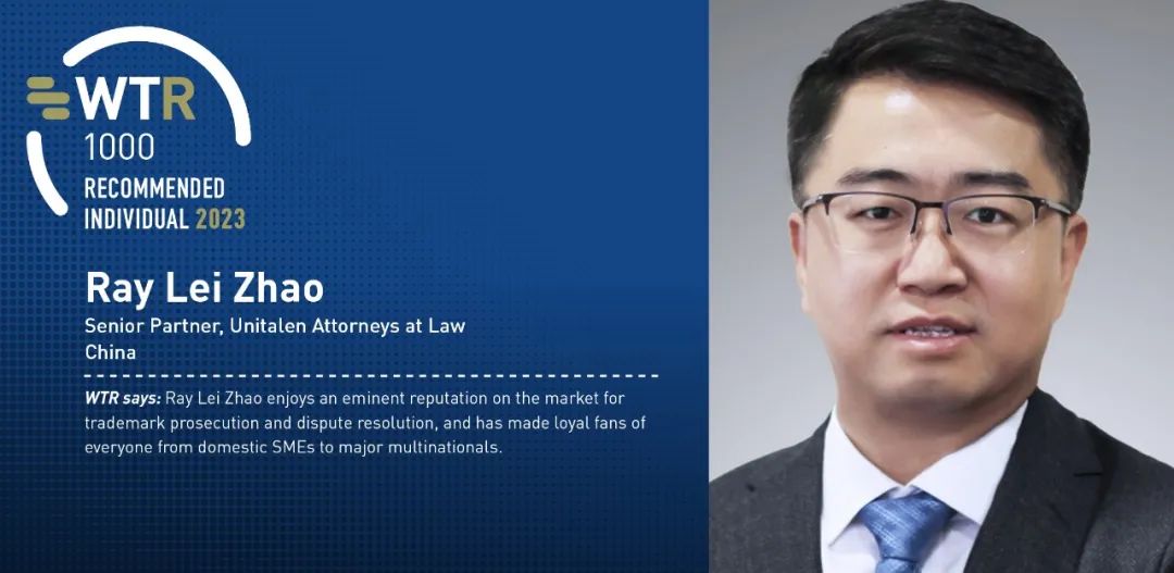 WTR評價:“作為團隊的領(lǐng)軍人物,趙雷律師在商標(biāo)申請和爭端解決方面享有卓著聲譽,在從國內(nèi)中小企業(yè)到大型跨國公司中都擁有的忠實擁躉?!?/em>
