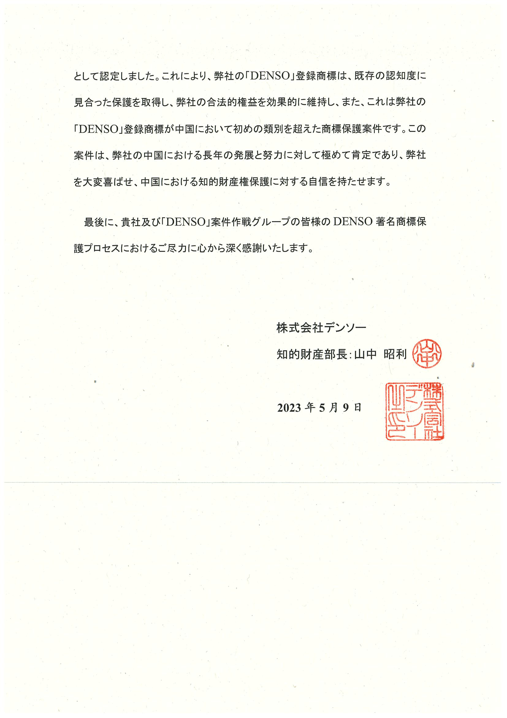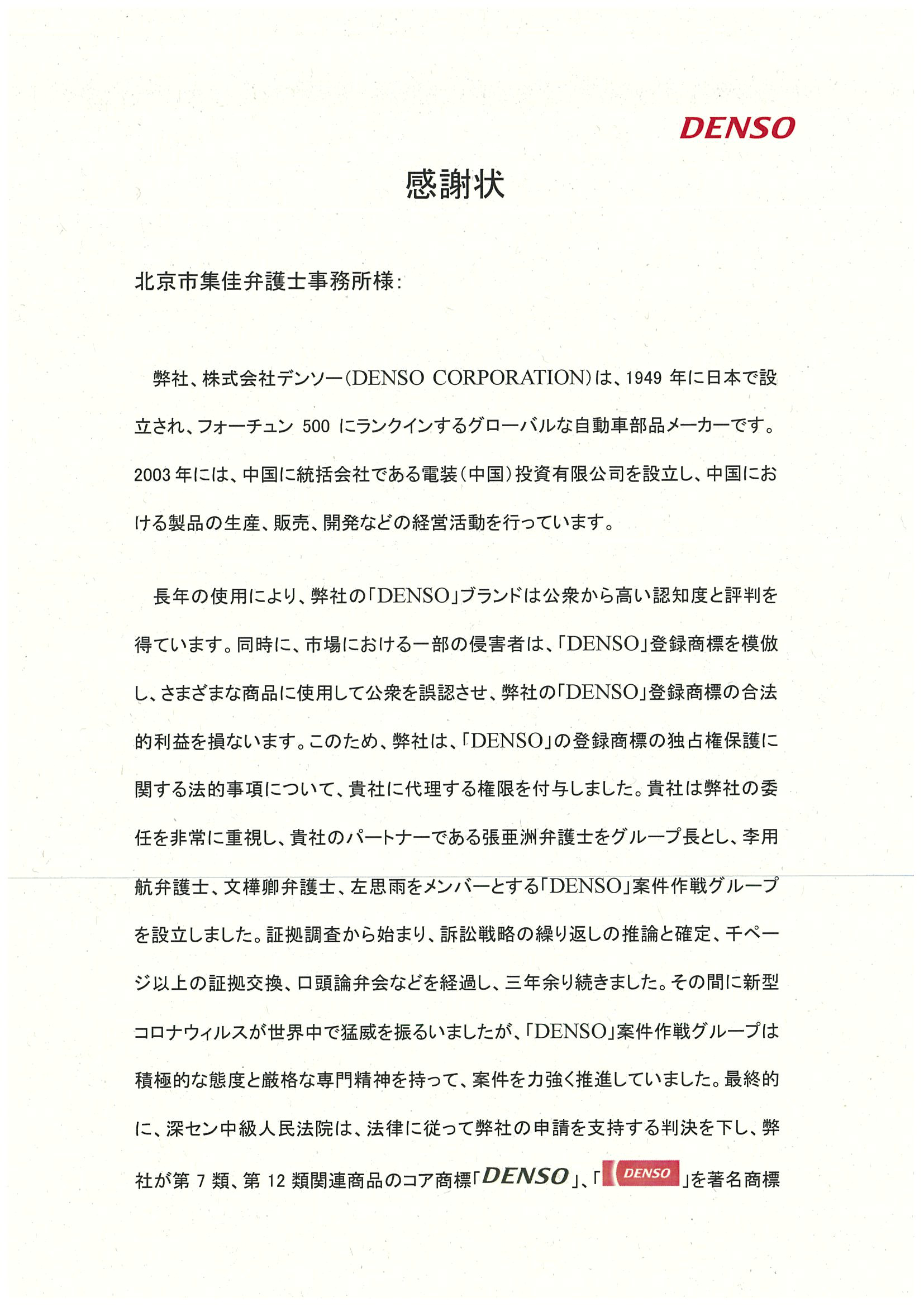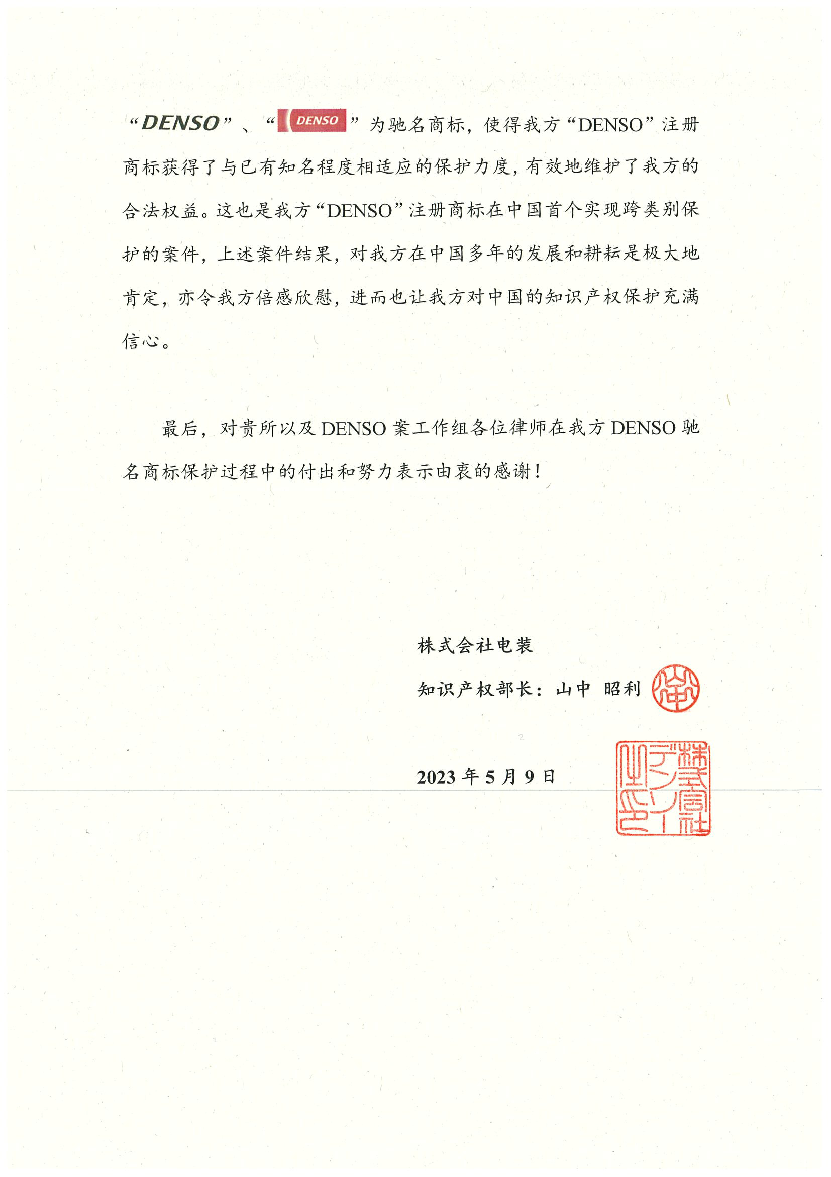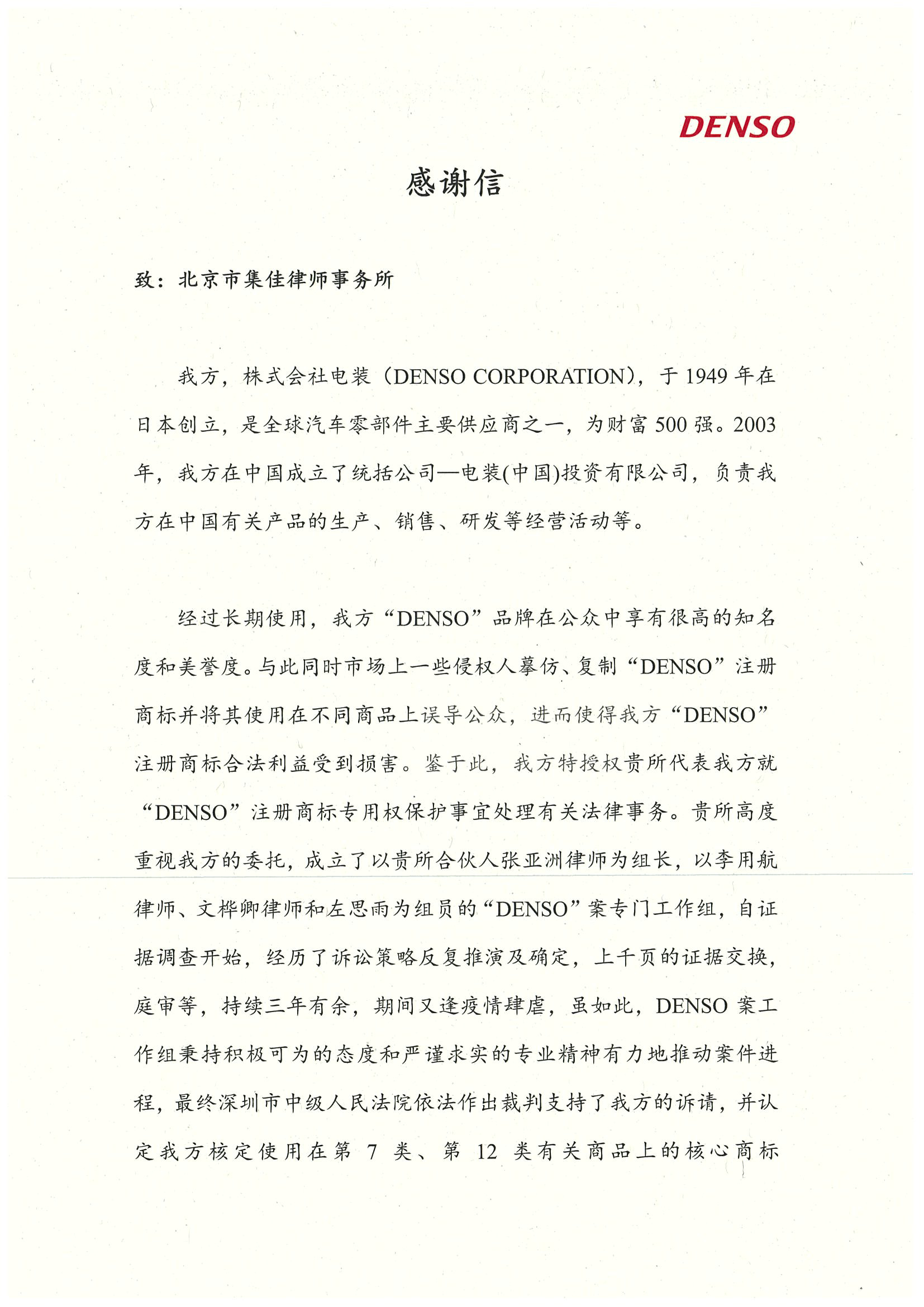 上述案件是“DENSO”注冊商標(biāo)在中國首個實(shí)現(xiàn)跨類別保護(hù)的案件,通過該案,集佳成功代理客戶使其“DENSO”注冊商標(biāo)獲得了與已有知名程度相適應(yīng)的保護(hù)力度,有效地維護(hù)了客戶的合法權(quán)益。