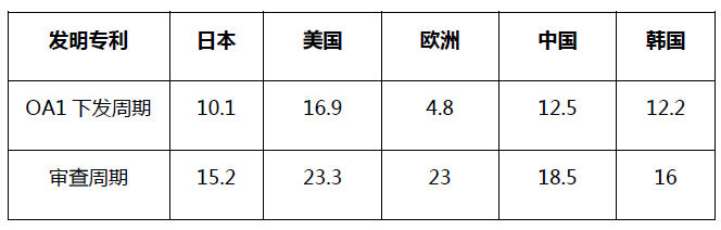 2021年五局發(fā)明OA1平均下發(fā)周期及平均審查周期對比:(單位:月)