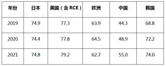 近三年五局發(fā)明授權(quán)率對比:(單位:百分比)