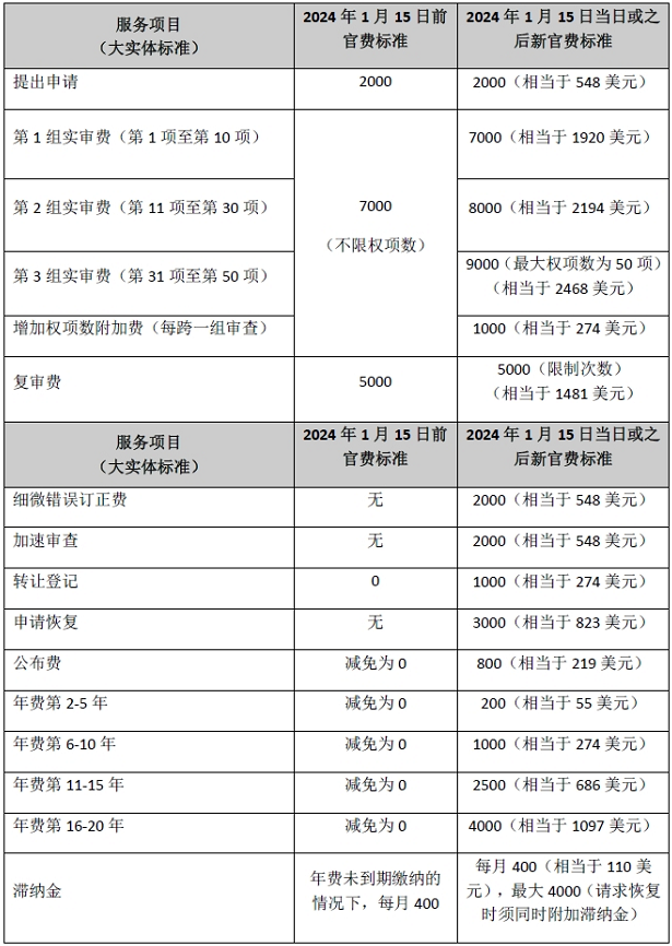 2023年11月15日,阿拉伯聯(lián)合酋長國(簡稱阿聯(lián)酋)經(jīng)濟部在官方公報中發(fā)布2023年第112號決議,宣布對專利、實用新型、工業(yè)外觀設計以及集成電路圖的官費進行調整,將征收一批新官費項目,如加速審查費用、超項審查費等,并恢復了一些之前取消的官費收費項目,如年費、公告費等。新官費標準已于2024年1月15日生效實施,發(fā)明專利申請中主要涉及的官費調整內容如下表所示: