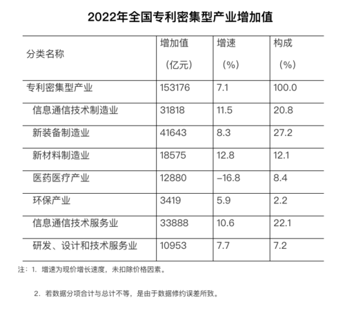 經核算,2022年全國專利密集型產業(yè)增加值為153176億元,比上年增長7.1%(未扣除價格因素,下同);占GDP的比重為12.71%,比上年提高0.27個百分點。