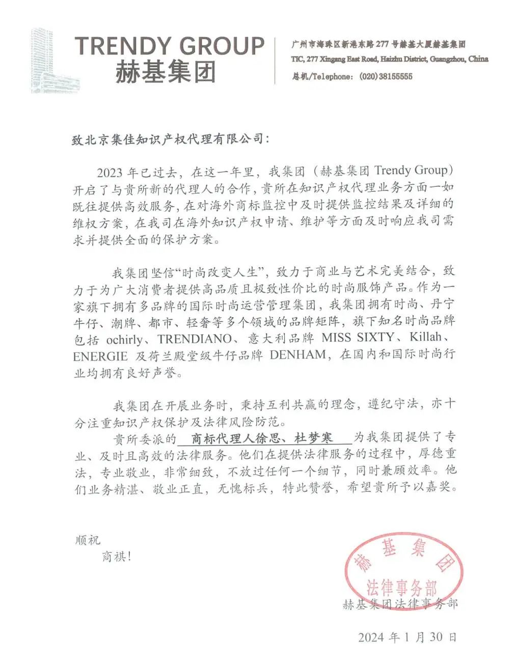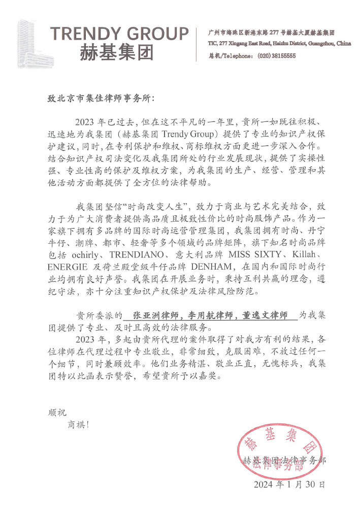 信中提到,2023年,集佳與赫基集團(tuán)在專利保護(hù)和維權(quán)、商標(biāo)維權(quán)方面更進(jìn)一步加強(qiáng)合作,集佳一如既往、迅速地為赫基集團(tuán)提供了專業(yè)的知識(shí)產(chǎn)權(quán)保護(hù)建議,集佳提供的實(shí)操性強(qiáng)、專業(yè)性高的保護(hù)及維權(quán)方案,為赫基集團(tuán)的生產(chǎn)、經(jīng)營(yíng)、管理和其他活動(dòng)方面都提供了全方位的法律幫助。赫基集團(tuán)法務(wù)部贊揚(yáng)集佳張亞洲律師、李用航律師董逸文律師、徐思律師、商標(biāo)代理人杜夢(mèng)寒等,在提供專業(yè)、及時(shí)且高效的法律服務(wù)的過(guò)程中,厚德重法,業(yè)務(wù)精湛,敬業(yè)正直,無(wú)愧標(biāo)兵。