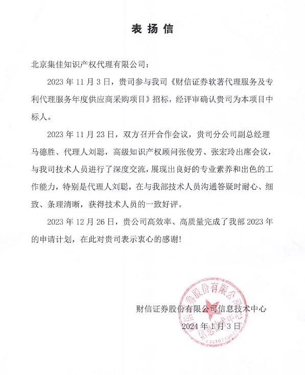 財(cái)信證券股份有限公司信息技術(shù)中心為集佳發(fā)來表揚(yáng)信,贊揚(yáng)集佳長(zhǎng)沙分公司副總經(jīng)理馬德勝、代理人劉聰,高級(jí)知識(shí)產(chǎn)權(quán)顧問張俊芳、張宏玲等,在為客戶提供專利代理服務(wù)的過程中展現(xiàn)出良好的專業(yè)素養(yǎng)與出色的工作能力,高效率、高質(zhì)量地幫助客戶完成了2023年專利申請(qǐng)計(jì)劃。特別是代理人劉聰,在與客戶技術(shù)人員溝通答疑時(shí)耐心、細(xì)致、條理清晰,獲得了技術(shù)人員的一致好評(píng)。