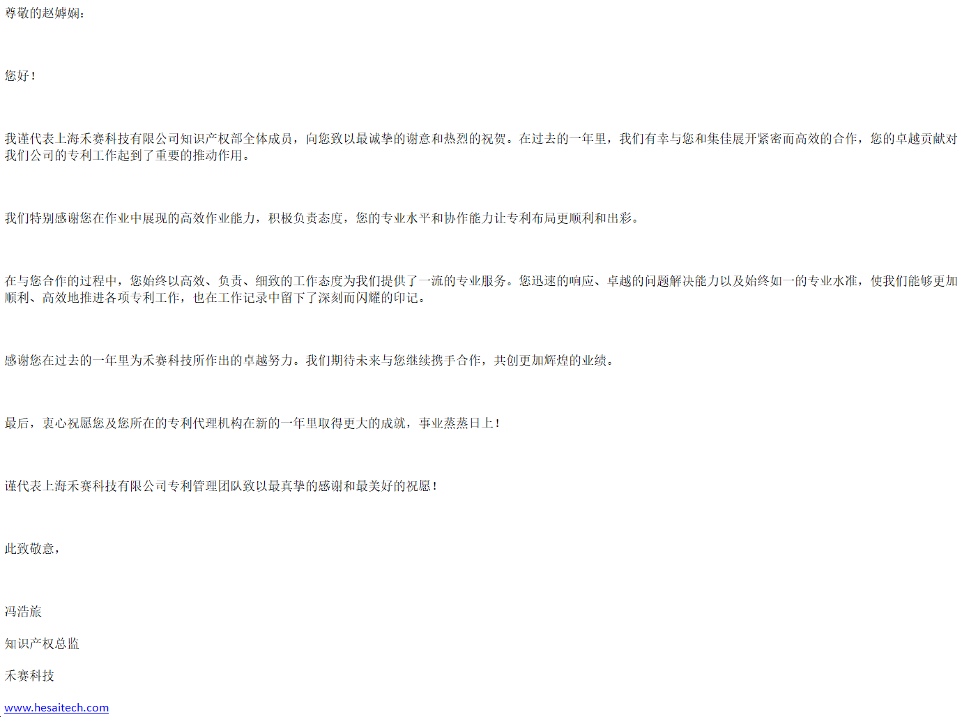 禾賽科技有限公司知識(shí)產(chǎn)權(quán)總監(jiān)馮浩旅致感謝信,稱贊上海分所代理人趙嫭嫻與趙景平以高效、負(fù)責(zé)、細(xì)致的工作態(tài)度為客戶提供了一流的專業(yè)服務(wù),在合作中展現(xiàn)了卓越的問題解決能力以及始終如一的專業(yè)水準(zhǔn),協(xié)助客戶順利、高效地推進(jìn)各項(xiàng)專利工作。期待未來與集佳繼續(xù)攜手合作,共創(chuàng)更加輝煌的業(yè)績(jī)。