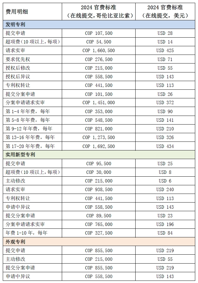 日前,哥倫比亞工商監(jiān)管局發(fā)布了關(guān)于2024年工業(yè)產(chǎn)權(quán)稅率調(diào)整的第60687號(hào)決議(Resolución No. 60687),調(diào)整后的新官費(fèi)標(biāo)準(zhǔn)已于2024年1月1日生效。具體費(fèi)用明細(xì)如下: