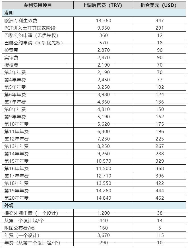 2024年4月24日,土耳其專利局公布了新的官費標(biāo)準(zhǔn),本次調(diào)整是繼2024年1月后今年的第二次官費調(diào)整,調(diào)整后官費標(biāo)準(zhǔn)如下: