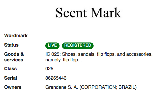 鞋類(lèi)連鎖店 Flip Flop Shops 在線下店鋪中使用的椰子香味已獲得商標(biāo)注冊(cè)。注冊(cè)人申請(qǐng)時(shí)提交了大量新聞報(bào)道,聲稱這種香味是他們品牌的重要識(shí)別部分。其中一個(gè)例子寫(xiě)道,“從 15 英尺外走近,椰子防曬油的香味和充滿能量的音樂(lè)開(kāi)始刺激感官,讓潛在顧客興奮不已?!?/p>
