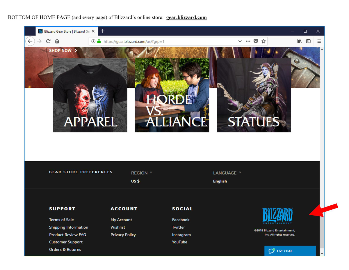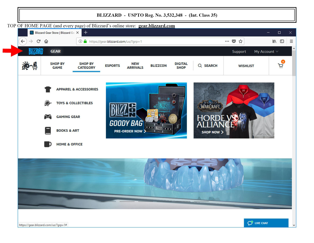 關(guān)于商標申請人關(guān)注的自營商店證據(jù)能否作為第35類使用證據(jù)被美國專利商標局接受這一問題。前文提及Blizzard面對Ava Labs提出的反訴理由曾主張其提交的使用證據(jù)是否存在瑕疵是審查員和申請人之間的問題,言外之意即是強調(diào)其提交的使用證據(jù)已被美國專利商標局審查員認可為合格的第35類使用證據(jù)。當前實踐中,審查員大部分情況下會接受申請人在自己官網(wǎng)使用申請商標零售自己產(chǎn)品的證據(jù)。作為參考,以下為Blizzard于2018維護其商標注冊時提交的第35類零售商店服務(wù)使用證據(jù),已被接受: