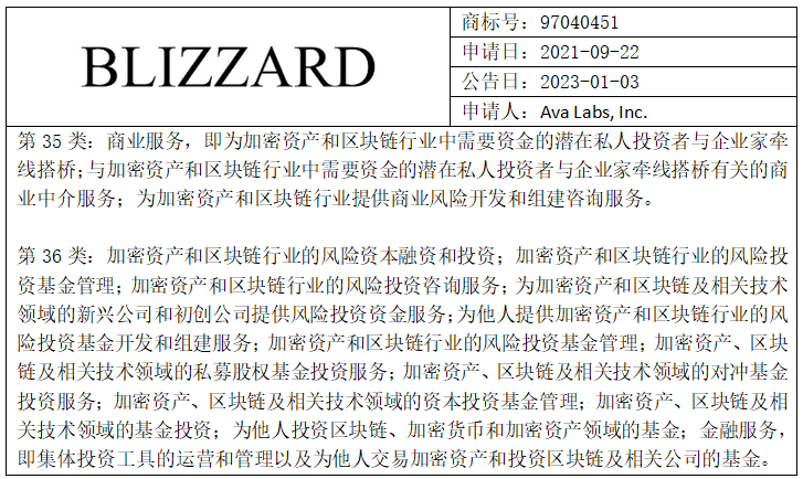 此次異議爭議源于Ava Labs向美國專利商標局申請注冊“BLIZZARD”商標,申請覆蓋與區(qū)塊鏈相關(guān)的第35類商業(yè)服務(wù)和第36類金融服務(wù)。經(jīng)初步審定,商標公告信息如下: