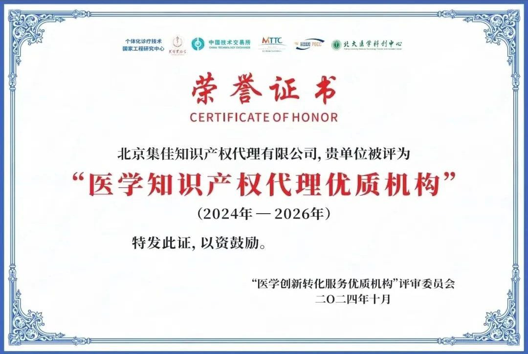 近日,2024年度“醫(yī)學創(chuàng)新轉(zhuǎn)化優(yōu)質(zhì)服務(wù)機構(gòu)”遴選結(jié)果在??谂e辦的個體化醫(yī)學研討會暨第四屆衛(wèi)生健康創(chuàng)新與轉(zhuǎn)化管理論壇上正式公布,北京集佳知識產(chǎn)權(quán)代理有限公司憑借在醫(yī)學創(chuàng)新成果知識產(chǎn)權(quán)保護與轉(zhuǎn)化方面的優(yōu)秀成績,榮獲2024年度“醫(yī)學知識產(chǎn)權(quán)代理優(yōu)質(zhì)機構(gòu)”稱號。